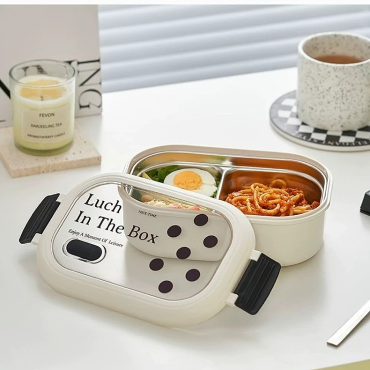 ظرف غذا گرم نگهدارنده فاقد موار مضر BPA free رنگ سفید با طرح خال خالی دارای محفظه استیل با کیفیت ۳۰۴ که محفظه رومیتونید به دلخواه جدا کنید