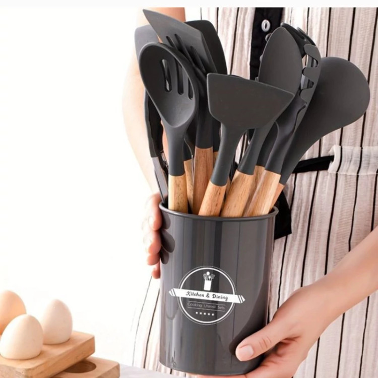 سرویس کفگیر Kitchen Set ساخته شده از با کیفیت ترین مواد سیلیکون با استاندارد FDA و بدون BPM ، دسته های چوبی از جنس بامبو و یک ظرف نگهدارنده از جنس پلاستیک میباشد. این سرویس از وزن متعادل و دیزاین منحصر بفردی برخوردار است که باعث میشود در دست گرفتن آن آسان و پخت و پز را راحت می کند. سیلیکون به کار رفته در این محصول ساخته شده از مواد غیر سمی ، بی بو و سازگار با محیط زیست است. این مجموعه وسایل آشپز خانه در برابر درجه حرارت سرما تا 30- و گرما 230+ درجه سانتی گراد مقاومت دارد. رنگبندی مشکی طوسی تیره در قسمت توضیحات رنگ انتخابی را درج کنید
