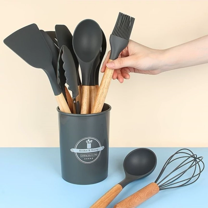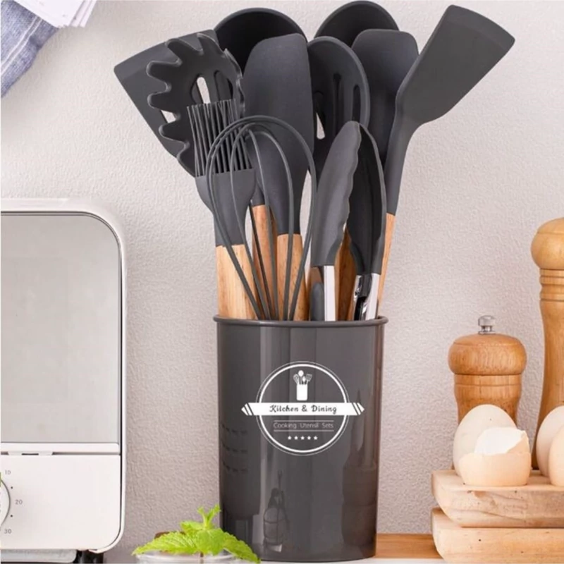 سرویس کفگیر Kitchen Set ساخته شده از با کیفیت ترین مواد سیلیکون با استاندارد FDA و بدون BPM ، دسته های چوبی از جنس بامبو و یک ظرف نگهدارنده از جنس پلاستیک میباشد. این سرویس از وزن متعادل و دیزاین منحصر بفردی برخوردار است که باعث میشود در دست گرفتن آن آسان و پخت و پز را راحت می کند. سیلیکون به کار رفته در این محصول ساخته شده از مواد غیر سمی ، بی بو و سازگار با محیط زیست است. این مجموعه وسایل آشپز خانه در برابر درجه حرارت سرما تا 30- و گرما 230+ درجه سانتی گراد مقاومت دارد. رنگبندی مشکی طوسی تیره در قسمت توضیحات رنگ انتخابی را درج کنید